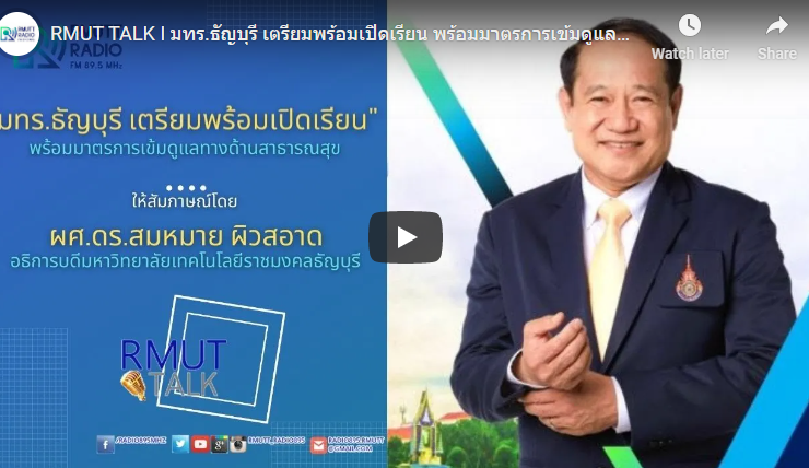 RMUT TALK I มทร.ธัญบุรี เตรียมพร้อมเปิดเรียน พร้อมมาตรการเข้มดูแลทางด้านสาธารณสุข สัมภาษณ์ ผศ.ดร.สมหมาย ผิวสอาด อธิการบดีมหาวิทยาลัยเทคโนโลยีราชมงคลธัญบุรี มทร.ธัญบุรี กับการเตรียมพร้อมเปิดเรียน มาตรการในการดูแลสถานการณ์การแพร่ระบาดของ Covid -19 ยังคงมีมาตรการเข้มข้นทางด้านสาธารณสุข รวมถึงเตรียมพร้อมเปิดการเรียนการ สิ่งที่ต้องปฏิบัติเมื่อเดินทางเข้ามาเรียน หรือปฏิบัติงานในมหาวิทยาลัยจะมีการวัดอุณหภูมิ ต้องสวมหน้ากากอนามัยก่อนเข้าอาคาร ในส่วนอาคารต่าง ๆ ได้มีการฉีดยาฆ่าเชื้อโรค ทำความสะอาดทุกวัน ...