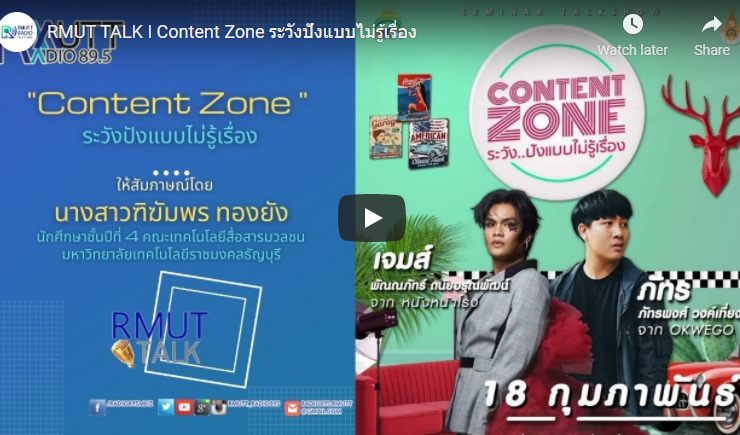 RMUT TALK I นักศึกษา มทร.ธัญบุรี เชิญชวนร่วมงานสัมมนา Conten tZone ระวังปังแบบไม่รู้เรื่อง สัมภาษณ์ นางสาว ฑิฆัมพร ทองยัง นักศึกษาชั้นปีที่ 4 คณะเทคโนโลยีสื่อสารมวลชน สาขาเทคโนโลยีการโทรทัศน์และวิทยุกระจายเสียง มทร.ธัญบุรี ContentZone ระวังปังแบบไม่รู้เรื่อง นำเสนอการทำคอนเทนท์ให้ดังได้โดยไม่จำเป็นต้องมีชื่อเสียงมาก่อน ให้ความรู้เรื่องการวางแผน และจัดทำคอนเทนท์ผ่านสื่อออนไลน์ให้น่าสนใจ จากวิทยากรชื่อดัง คุณภัทร OKWEGO โปรดิวเซอร์ ช่องดังจาก GoodDay Official และ คุณเจมส์ จาก ช่องหนังหน้าโรง วันพฤหัสบดีที่ 18 กุมภาพันธ์ 2564 เวลา 13.00-14.30 ...