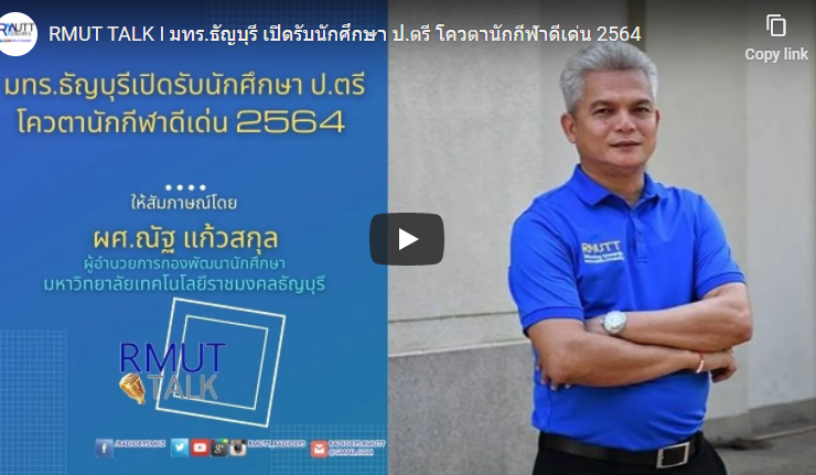 RMUT TALK I มทร.ธัญบุรี เปิดรับนักศึกษา ป.ตรี โควตานักกีฬาดีเด่น 2564 . สัมภาษณ์ ผศ.ณัฐ แก้วสกุล ผู้อำนวยการกองพัฒนานักศึกษา มทร.ธัญบุรี . มหาวิทยาลัยเทคโนโลยีราชมงคลธัญบุรี รับสมัครคัดเลือกบุคคลเข้าศึกษาต่อระดับปริญญาตรี โควตานักกีฬาดีเด่น ม.6 ปวช. ปวส. กศน. ประจำปีการศึกษา 2564 โดยทางมหาวิทยาลัยได้เปิดรับนักศึกษาจาก โครงการพิเศษ ตามนโยบายของมหาวิทยาลัยเทคโนโลยีราชมงคลธัญบุรีโดยได้รับอนุมัติจากอธิการบดีมหาวิทยาลัยเทคโนโลยีราชมงคลธัญบุรี หนึ่งในโครงการพิเศษคือ โควตานักกีฬาดีเด่น รับผู้สมัครที่มีความสามารถโดดเด่นทางด้านกีฬาประเภท ต่าง ๆ ตามที่กำหนดไว้ในประกาศของมหาวิทยาลัย เมื่อผู้ผ่านการคัดเลือกที่มีสิทธิ์เข้าศึกษาปฏิบัติตามทุกขั้นตอนแล้ว จึงจะมีสถานะเป็นนักศึกษามหาวิทยาลัยเทคโนโลยีราชมงคลธัญบุรี ประจำปีการศึกษา 2564 โดยสมบูรณ์ เปิดรับสมัครตั้งแต่บัดนี้ – ...