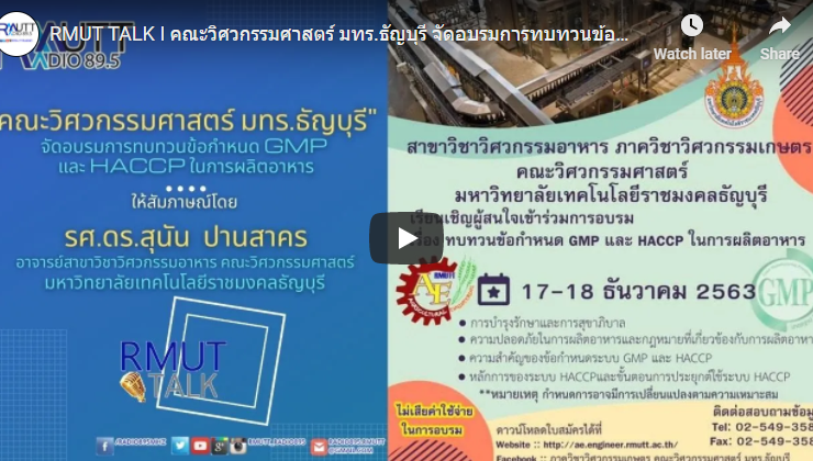 RMUT TALK I คณะวิศวกรรมศาสตร์ มทร.ธัญบุรี จัดอบรมการทบทวนข้อกำหนด GMP และ HACCP ในการผลิตอาหาร สัมภาษณ์ รศ.ดร.สุนัน ปานสาคร อาจารย์ประจำคณะวิศวกรรมศาสตร์ มทร.ธัญบุรี สาขาวิชาวิศวกรรมอาหาร คณะวิศวกรรมศาสตร์ มทร.ธัญบุรี จัดอบรมการทบทวนข้อกำหนด GMP และ HACCP ในการผลิตอาหาร ระหว่างวันที่ 17-18 ธันวาคม 2563 หัวข้อการอบรมเกี่ยวกับ การบำรุงรักษาและสุขาภิบาล ความปลอดภัยในการผลิตอาหารและกฎหมายที่เกี่ยวข้อง ทางวิทยุราขชมงคลธัญบุรี FM 89.5MHZ Website : http://www.radio.rmutt.ac.th/ Facebook : https://www.facebook.com/RMUTTRadio Youtube ...