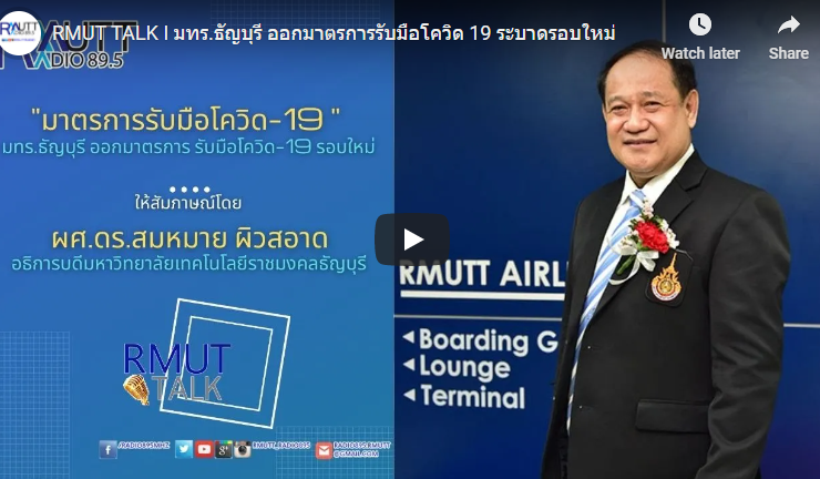 RMUT TALK I มทร.ธัญบุรี ออกมาตรการรับมือโควิด 19 ระบาดรอบใหม่ สัมภาษณ์ ผศ.ดร.สมหมาย ผิวสอาด อธิการบดี มหาวิทยาลัยเทคโนโลยีราชมงคลธัญบุรี มทร.ธัญบุรี กับการเตรียมการมาตรการรับมือกับ COVID-19 ระลอกใหม่ มาตรการในการดูแลสถานการณ์การแพร่ระบาดของ Covid -19 ยังคงมีมาตรการเข้มข้นทางด้านสาธารณสุข รวมถึงเตรียมพร้อมเปิดการเรียนการสอนระบบออนไลน์ ทันที ส่วนบุคลากรจะจัดให้ทำงานแบบ Work from home ส่วนคนที่จำเป็นจะต้องเข้ามาปฏิบัติงานในมหาวิทยาลัยจะมีการวัดอุณหภูมิ สวมหน้ากากอนามัยก่อนเข้าอาคาร ในส่วนอาคารต่าง ๆ ได้มีการฉีดยาฆ่าเชื้อโรค ทำความสะอาดทุกวันและปิดห้องเรียนนั้นๆ จนกว่าสถานการณ์จะคลี่คลาย ...