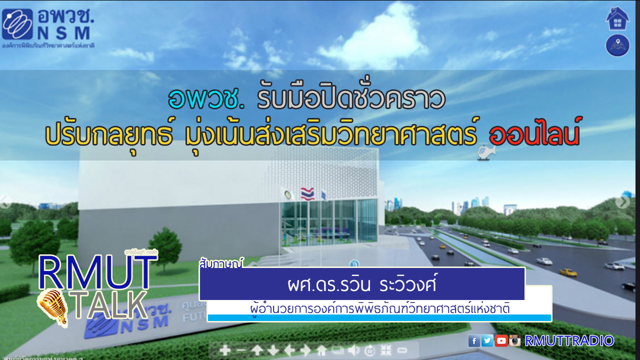 https://www.facebook.com/173993725962646/videos/2505781472967901/ #RMUTTALK l อพวช. ปิดให้บริการพิพิธภัณฑ์ และส่งเสริมการเรียนรู้ Online . ผศ.ดร.รวิน ระวิวงศ์ ผู้อำนวยการองค์การพิพิธภัณฑ์วิทยาศาสตร์แห่งชาติ . องค์การพิพิธภัณฑ์วิทยาศาสตร์แห่งชาติ ห่วงใยประชาชนและผู้เข้าชม โดยจะทำการปิดให้บริการการเดินทางเข้ามาเที่ยวชมพิพิธภัณฑ์ ตั้งแต่วันเสาร์ที่ 21 มีนาคม 2563 จนกว่าสถานการณ์จะคลี่คลาย จัดให้มีสื่อการเรียนรู้วิทยาศาสตร์ออนไลน์ ในรูปแบบต่างๆเพื่อส่งเสริมให้ครอบครัวและเยาวชนที่อยู่บ้าน สามารถหาความสนุกสนานบันเทิงอย่างสร้างสรรค์ ด้วยการนาเสนอองค์ความรู้เสริฟ์ถึงบ้านด้วย Science Deliveree by NSM ช่องทางการเข้าถึงสื่อต่าง ๆ ของ อพวช. คือ Facebook : NSMTHAILAND สอบถามรายละเอียดเพิ่มเติมได้ที่หมายเลขโทรศัพท์ 02-577-9999 เว็บไซด์ www.nsm.or.th ...