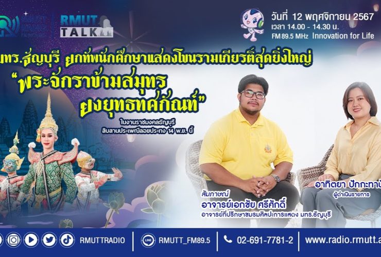 RMUT TALK l มทร.ธัญบุรี ยกทัพนักศึกษาแสดงโขนรามเกียรติ์สุดยิ่งใหญ่ “พระจักราข้ามสมุทร ยงยุทธทศกัณฑ์” ในงานราชมงคลธัญบุรี สืบสานประเพณีลอยประทง 14 พ.ย.นี้ สัมภาษณ์ อาจารย์เอกชัย ศรีศักดิ์ อาจารย์ที่ปรึกษาชมรมศิลปะการแสดง มทร.ธัญบุรี ขอเชิญชวนทุกท่านร่วมงาน “สืบสานประเพณีลอยกระทง ราชมงคลธัญบุรี” พบกับบรรยากาศสุดประทับใจที่เราตั้งใจจัดขึ้น ร่วมสักการะพระพุทธพิริยมงคล เพื่ออนุรักษ์และส่งต่อประเพณีลอยกระทง ซึ่งเปรียบเสมือนการขอขมาและขอบคุณต่อแม่น้ำ 14 พฤศจิกายน เวลา 18.00 น. กับการแสดงโขนรามเกียรติ์ ตอน พระจักราข้ามสมุทรยงยุทธทศกัณฑ์ โดยชมรมศิลปะการแสดง มทร.ธัญบุรี และเตรียมพบกับความสนุกและความบันเทิงมากมายในงาน การประกวด‟นางนพมาศราชมงคลธัญบุรี” การประกวดสร้างสรรค์ประดิษฐ์กระทง การแสดงโขน รำวงย้อยยุค คอนเสิร์ตจากศิลปินรับเชิญ จาก“RMUTT ...