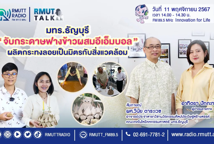 RMUT TALK l มทร.ธัญบุรี จับกระดาษฟางข้าวผสมอีเอ็มบอล ผลิตกระทงลอยเป็นมิตรกับสิ่งแวดล้อม สัมภาษณ์ ผศ.วินัย ตาระเวช อาจารย์ประจำหลักสูตรคหกรรมศาสตรบัณฑิต สาขาวิชานวัตกรรมศิลปประดิษฐ์สร้างสรรค์ คณะเทคโนโลยีคหกรรมศาสตร์ มทร.ธัญบุรี ไอเดียดี ๆ จากอาจารย์ประจำหลักสูตรคหกรรมศาสตรบัณฑิต สาขาวิชานวัตกรรมศิลปประดิษฐ์สร้างสรรค์ คณะเทคโนโลยีคหกรรมศาสตร์ มหาวิทยาลัยเทคโนโลยีราชมงคลธัญบุรี ผลิตกระทงอีเอ็มบอล ทำจากกระดาษจากฟางข้าวผสมอีเอ็มบอล เป็นมิตรต่อสิ่งแวดล้อม ที่สำคัญบำบัดน้ำเสียและปรับปรุงสภาพน้ำในช่วงเทศกาลวันลอยกระทง โดยมี ผู้ช่วยศาสตราจารย์วินัย ตาระเวช ผู้ช่วยศาสตราจารย์จุฬาภรณ์ ศรีเมืองไหม และผู้ช่วยศาสตราจารย์โสภิดา วิศาลศักดิ์กุล เป็นเจ้าของไอเดีย รับฟังได้ทาง FM 89.5 MHz. Innovation for Life วิทยุราชมงคลธัญบุรี ออกอากาศ ...