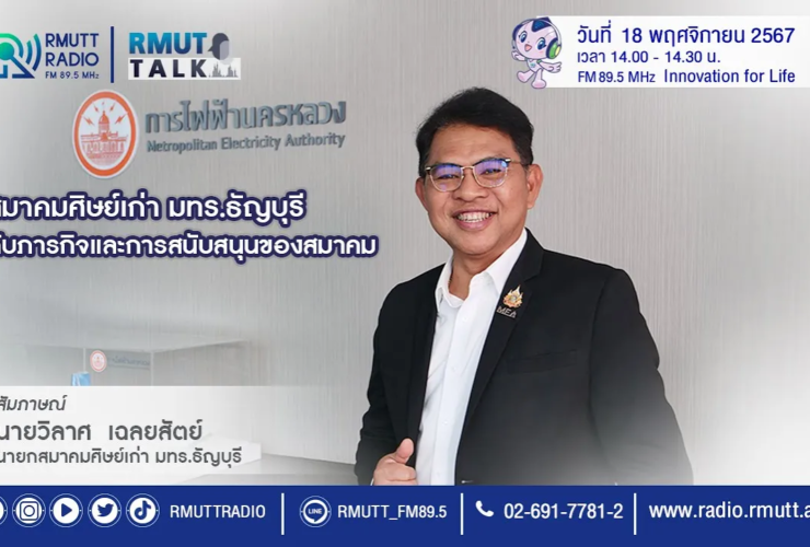 RMUT TALK l นายกสมาคมศิษย์เก่า มทร.ธัญบุรี กับภารกิจและการสนับสนุนของสมาคม สัมภาษณ์ นายวิลาศ เฉลยสัตย์ นายกสมาคมศิษย์เก่า มทร.ธัญบุรี การค้นหาตัวเองให้เจอ การวางแผนการดำเนินชีวิต การทำงานครั้งแรกอาจจะไม่ตรงตามที่เราชอบ แต่สิ่งสำคัญเราต้องมีความใฝ่รู้ ฝึกปฎิบัติ เข้ากับสังคมง่าย และเน้นลงมือทำ เพราะเราทุกคนล้วนมีความสามารถ สิ่งนั้นจะการพัฒนาตัวเราให้ประสบความสำเร็จ รับฟังได้ทาง FM 89.5 MHz. Innovation for Life วิทยุราชมงคลธัญบุรี ออกอากาศ วันที่ 18 พฤศจิกายน 2567 เวลา 14.00 – 14.30 น. ผู้ดำเนินรายการ อาทิตยา ...