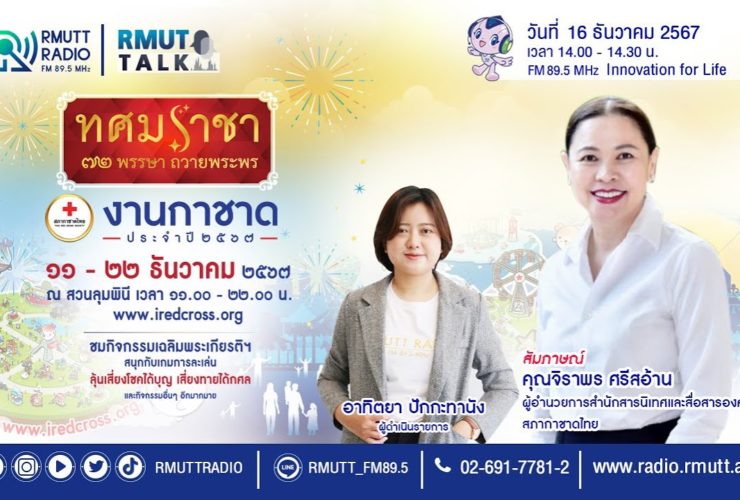 RMUT TALK l สภากาชาดไทย ชวนร่วมงานกาชาด ประจำปี 2567 ทศมราชา 72 พรรษา ถวายพระพร สัมภาษณ์ คุณจิราพร ศรีสอ้าน ผู้อำนวยการสำนักสารนิเทศและสื่อสารองค์กร สภากาชาดไทย เตรียมตัวให้พร้อมแล้วมาร่วมสัมผัสมนต์เสน่ห์อัตลักษณ์งานกาชาด มหรสพรื่นเริงการกุศลแห่งปี ระหว่างวันที่ 11 – 22 ธันวาคม 2567 ตลอด 12 วัน 12 คืน ตั้งแต่เวลา 11.00 – 22.00 น. วันสุดท้ายปิดงาน เวลา 23.00 น. ณ สวนลุมพินีเข้างานฟรีไม่เสียค่าใช้จ่าย ...