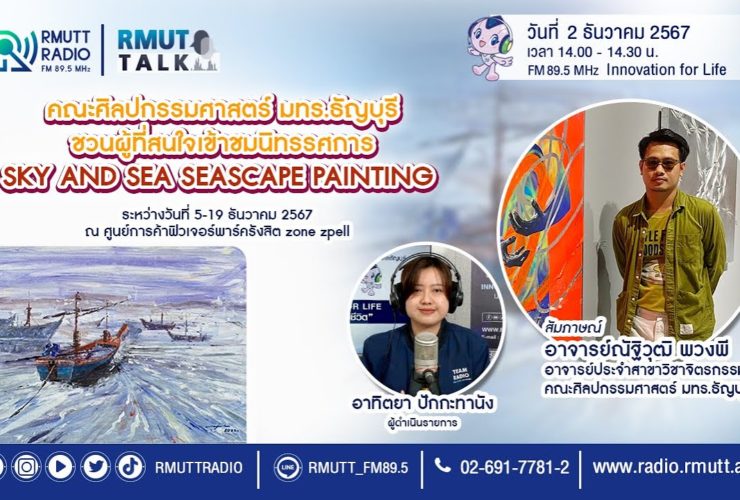 RMUT TALK l คณะศิลปกรรมศาสตร์ มทร.ธัญบุรี ชวนผู้ที่สนใจเข้าชมนิทรรศการ SKY AND SEA SEASCAPE PAINTING สัมภาษณ์ อาจารย์ณัฐิวุฒิ พวงพี อาจารย์ประจำสาขาวิชาจิตรกรรม คณะศิลปกรรมศาสตร์ มทร.ธัญบุรี คณะศิลปกรรมศาสตร์ มทร.ธัญบุรี ชวนผู้ที่สนใจเข้าชมนิทรรศการ SKY AND SEA SEASCAPE PAINTING วันที่ 5-19 ธ.ค.นี้ ณ ศูนย์การค้าฟิวเจอร์พาร์ครังสิต คณะศิลปกรรมศาสตร์ มหาวิทยาลัยเทคโนโลยีราชมงคลธัญบุรี ขอเชิญชวนผู้ที่สนใจเข้าร่วมชมนิทรรศการ “SKY AND SEA” SEASCAPE PAINTING ระหว่างวันที่ 5-19 ...