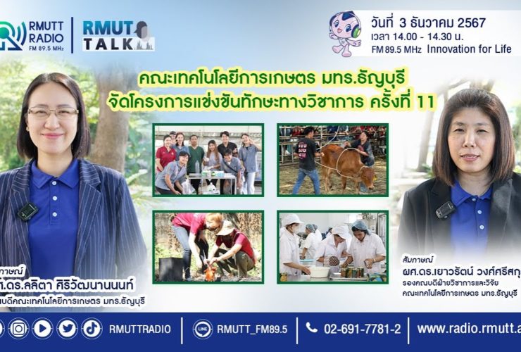 RMUT TALK l คณะเทคโนโลยีการเกษตร มทร.ธัญบุรี จัดโครงการแข่งขันทักษะทางวิชาการ ครั้งที่ 11 สัมภาษณ์ ผศ.ดร.ลลิตา ศิริวัฒนานนนท์ คณบดีคณะเทคโนโลยีการเกษตร ผศ.ดร.เยาวรัตน์ วงศ์ศรีสกุลแก้ว รองคณบดีฝ่ายวิชาการและวิจัย คณะเทคโนโลยีการเกษตร นักศึกษาคณะเทคโนโลยีการเกษตร วันพฤหัสบดี ที่ 28 พฤศจิกายน 2567 คณะเทคโนโลยีการเกษตร มทร.ธัญบุรี จัดโครงการแข่งขันทักษะทางวิชาการ ครั้งที่ 11 ณ ห้องประชุมอินทนิล 1 อาคาร 70 ปี เกษตรปทุมธานี คณะเทคโนโลยีการเกษตร มทร.ธัญบุรี ศูนย์รังสิต โดยมี ผู้ช่วยศาสตราจารย์ ดร.ลลิตา ...