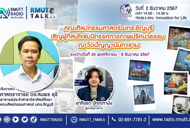 RMUT TALK l คณะศิลปกรรมศาสตร์ มทร.ธัญบุรี เชิญผู้ที่สนใจชมนิทรรศการภาพปริศนาธรรม ณ วัดปัญญานันทาราม สัมภาษณ์ ศาสตราจารย์ ดร.สมพร ธุรี อาจารย์ประจำสาขาวิชาศิลปศึกษา คณะศิลปกรรมศาสตร์ มทร.ธัญบุรี คณะศิลปกรรมศาสตร์ มหาวิทยาลัยเทคโนโลยีราชมงคลธัญบุรี ขอเชิญเข้าร่วม กิจกรรมภาพธรรมศิลป์ (ปริศนาธรรม) ระหว่างวันที่ 30 พฤศจิกายน – 8 ธันวาคม 2567 ณ วัดปัญญานันทาราม รับฟังได้ทาง FM 89.5 MHz. Innovation for Life วิทยุราชมงคลธัญบุรี ออกอากาศ วันที่ 2 ...