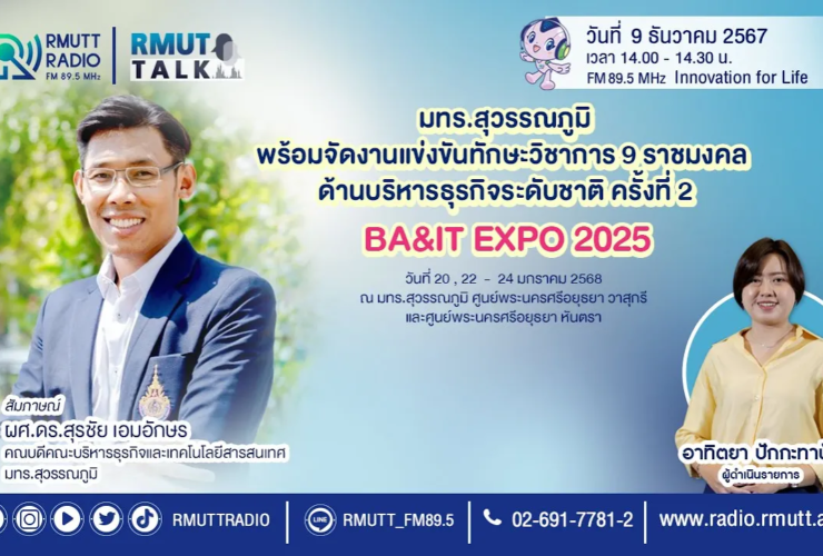 RMUT TALK l มทร.สุวรรณภูมิ พร้อมจัดงานแข่งขันทักษะวิชาการ 9 ราชมงคลด้านบริหารธุรกิจระดับชาติ ครั้งที่ 12 BA&IT EXPO 2025 สัมภาษณ์ ผศ.ดร.สุรชัย เอมอักษร ผู้ช่วยศาสตราจารย์ ดร.สุรชัย เอมอักษร คณบดีคณะบริหารธุรกิจและเทคโนโลยีสารสนเทศ มทร.สุวรรณภูมิ มทร.สุวรรณภูมิจัดใหญ่ ‘BA&IT EXPO 2025’ โครงการสัมมนาและการแข่งขันทักษะวิชาการด้านบริหารธุรกิจ 9 มทร. ครั้งที่ 12 ชิงถ้วยพระราชทาน สมเด็จพระกนิษฐาธิราชเจ้า กรมสมเด็จพระเทพรัตนราชสุดาฯ สยามบรมราชกุมารี ผู้ช่วยศาสตราจารย์ ดร.สุรชัย เอมอักษร คณบดีคณะบริหารธุรกิจและเทคโนโลยีสารสนเทศ มทร.สุวรรณภูมิ กล่าวในงานแถลงข่าว BA&IT ...