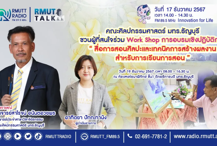 RMUT TALK l คณะศิลปกรรมศาสตร์ มทร.ธัญบุรี ชวนผู้ที่สนใจร่วม Work Shop การอบรมเชิงปฏิบัติการ “สื่อการสอนศิลปะและเทคนิคการสร้างผลงานสำหรับการเรียนการสอน” สัมภาษณ์ อาจารย์สาโรจน์ อนันตอวยพร อาจารย์ประจำสาขาวิชาจิตรกรรม คณะศิลปกรรมศาสตร์ มทร.ธัญบุรี คณะศิลปกรรมศาสตร์ มหาวิทยาลัยเทคโนโลยีราชมงคลธัญบุรี (มทร.ธัญบุรี) ขอเชิญชวนผู้ที่สนใจสมัครเข้าร่วมกิจกรรม Work Shop การอบรมเชิงปฏิบัติการ หัวข้อ “สื่อการสอนศิลปะและเทคนิคการสร้างผลงานสำหรับการเรียนการสอน” จัดโดยบริษัท HHK ร่วมกับภาควิชาทัศนศิลป์ คณะศิลปกรรมศาสตร์ มทร.ธัญบุรี ในวันที่ 19 ธันวาคม 2567 เวลา 08.00 – 16.30 น. ณ ...
