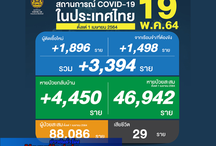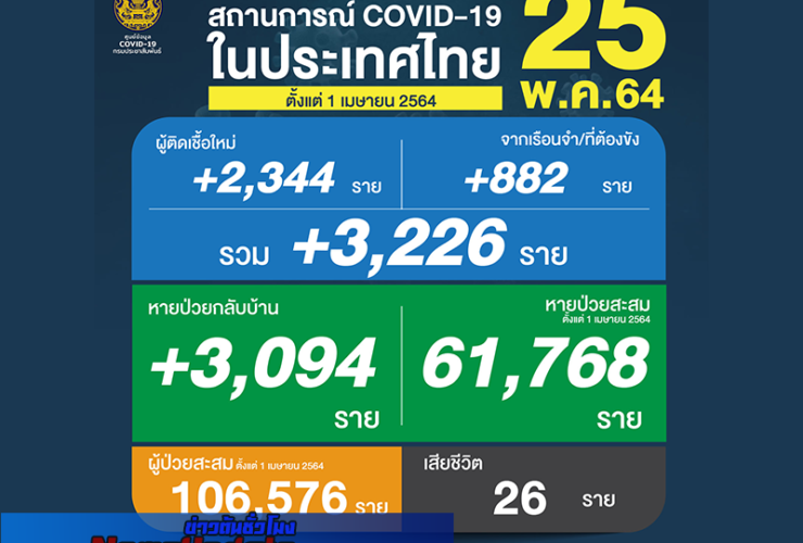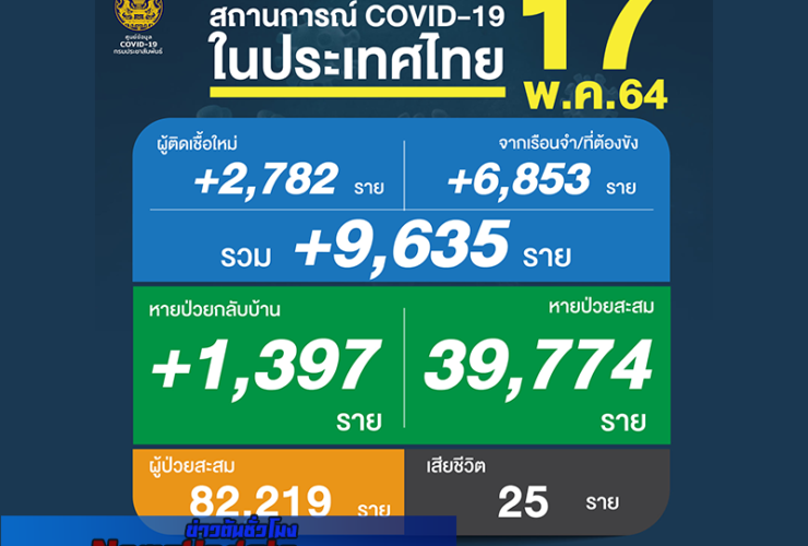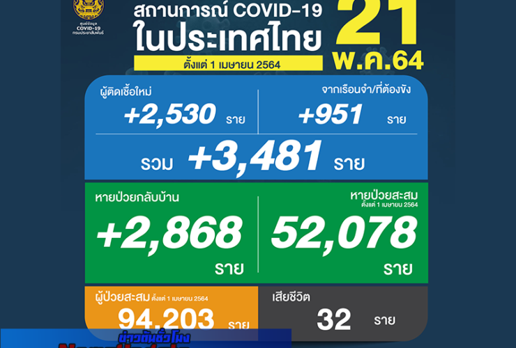 08.00 บสย. ชี้สัญญาณดี ค้ำประกัน สินเชื่อฟื้นฟู ตัวเร่งฟื้นเศรษฐกิจ 18 พ.ค. อนุมัติค้ำแล้ว 2,840 ล้านบาท 2,260 ฉบับ . 09.00 คปภ.เผยประชาชนซื้อประกันโควิดแตะ 8 แสนฉบับ วงเงินเบี้ย 96 ล้านบาท พร้อมออกคำสั่งคุ้มครองฉีดวัคซีน ณ จุดบริการนอกโรงพยาบาลฯ . 10.00 ข่าวราชมงคล // รองปลัดกระทรวงคมนาคม ยืนยัน ผู้ประกอบการรถโดยสารสาธารณะ รับวัคซีนโควิด-19 ต้องลงทะเบียน ผ่านระบบกรมขนส่งฯ ย้ำยังไม่เปิด walk in . 11.00 กระทรวงแรงงานบูรณาการทุกฝ่าย ...