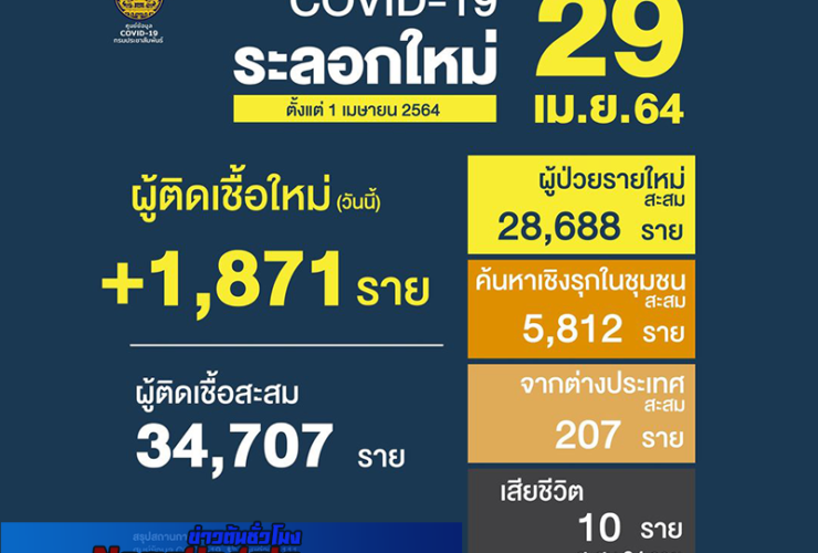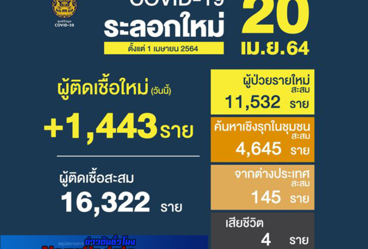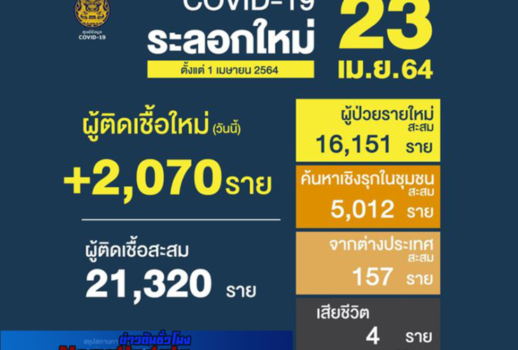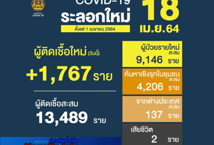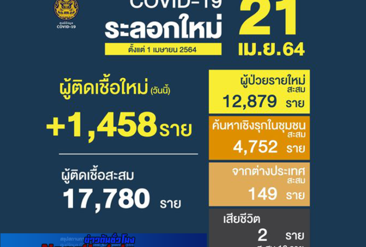08.00 ผู้ว่า ททท. ยืนยันเปิดจองเราเที่ยวด้วยกันเฟส 3 กลางเดือนพ.ค.นี้ รับยอดติดเชื้อพุ่ง 2,000 คน กระทบต่อเชื่อมั่น . 09.00 ประธานกรรมการหอการค้าไทย เผย เอกชนเดินหน้าเต็มที่ทำแผนวางระบบกระจายวัคซีนโควิด-19 สร้างความเชื่อมั่น เพื่อให้เดินหน้าได้อย่างรวดเร็ว . 10.00 ข่าวราชมงคล // สภาผู้ส่งสินค้าทางเรือ มอง ส่งออกไทยมีแนวโน้มดี คู้ค้าเศรษฐกิจเริ่มฟื้นหลังฉีดวัคซีนโควิด-19 เปิดนำเข้าสินค้าไทยมากขึ้น . 11.00 รัฐมนตรีว่าการกระทรวงคมนาคม จ่อเสนอรัฐบาล ฉีดวัคซีนป้องกันโควิด-19 ให้ผู้ปฏิบัติงานแนวหน้าภาคคมนาคมขนส่งทุกระบบ มอบปลัดตั้งคณะทำงาน . 12.00 ศบค.ยืนยันสะกัดกั้นการแพร่ระบาดเชื้อโควิด-19 สายพันธุ์อินเดียอย่างเข้มข้น ผู้ป่วยชาวอินเดีย 7 ราย ...
