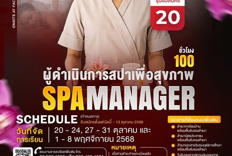 คณะการแพทย์บูรณาการ มหาวิทยาลัยเทคโนโลยีราชมงคลธัญบุรี (มทร.ธัญบุรี) ชวนผู้ที่สนใจสมัครเข้าอบรมหลักสูตรผู้ดำเนินการสปาเพื่อสุขภาพ 100 ชั่วโมง (Spa manager) รุ่นที่ 20 โดยจะมีการอบรมในช่วง วันที่ 20 – 24 , 27 – 31 ตุลาคม และวันที่ 1-8 พฤศจิกายน 2568 จำนวน 16 วัน ณ คณะการแพทย์บูรณาการ มทร.ธัญบุรี ศูนย์รังสิต . สำหรับรูปแบบการอบรมเป็น Onsite ลงมือปฏิบัติจริงทุกขั้นตอน รับรองหลักสูตรโดย กรมสนับสนุนบริการสุขภาพ (สบส.) ค่าสมัครอบรม 13,000 ...