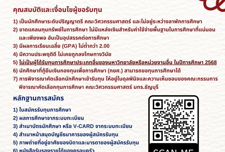 คณะวิศวกรรมศาสตร์ มหาวิทยาลัยเทคโนโลยีราชมงคลธัญบุรี (มทร.ธัญบุรี) ชวนผู้ที่สนใจสมัครเข้ารับทุนการศึกษา ประจำปีการศึกษา 2568 จำนวน 20 ทุน มูลค่าทุนละ 5,000 บาท โดยมีคุณสมบัติและเงื่อนไขผู้ขอรับทุน ดังนี้ . 1. เป็นนักศึกษาระดับปริญญาตรี คณะวิศวกรรมศาสตร์ มหาวิทยาลัยเทคโนโลยีราชมงคลธัญบุรี และไม่อยู่ระหว่างลาพักการศึกษา 2. ขาดแคลนทุนทรัพย์ในการศึกษา ไม่มีแหล่งเงินสำหรับค่าใช้จ่ายพื้นฐานในการศึกษาที่แน่นอนและเพียงพอ อันเป็นอุปสรรคต่อการศึกษา 3. มีผลการเรียนเฉลี่ย (GPA) ไม่ต่ำกว่า 2.00 4. มีความประพฤติดี ไม่เคยถูกลงโทษทางวินัย 5. ไม่เคยได้รับทุนการศึกษาประเภทอื่นของมหาวิทยาลัยหรือหน่วยงานอื่น ในปีการศึกษา 2568 6. นักศึกษาที่กู้ยืมเงินกองทุนเพื่อการศึกษา (กยศ.) สามารถขอทุนการศึกษาได้ ...