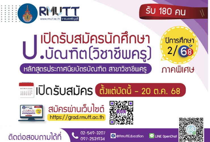 คณะครุศาสตร์อุตสาหกรรม มหาวิทยาลัยเทคโนโลยีราชมงคลธัญบุรี กำหนดเปิดรับสมัครและสอบคัดเลือกบุคคลเข้าศึกษาต่อระดับประกาศนียบัตรบัณฑิต สาขาวิชาชีพครู ภาคพิเศษ ภาคเรียนที่ 2 ปีการศึกษา 2568 จำนวน 180 คน ตั้งแต่บัดนี้ – 20 ตุลาคม 2568 . คุณสมบัติของผู้สมัครจะต้องสำเร็จการศึกษาระดับปริญญาตรีทุกสาขา หรือ เทียบเท่าจากสถาบันการศึกษาที่สำนักงานคณะกรรมการข้าราชการพลเรือน หรือ ก.พ. และกระทรวงการอุดมศึกษา วิทยาศาสตร์ วิจัย และนวัตกรรม หรือ อว. ให้การรับรอง ในสาขาวิชาที่สอดคล้องกับหลักสูตรการศึกษาปฐมวัย หรือตรงกับกลุ่มสาระการเรียนรู้หลักสูตรแกนกลางการศึกษาขั้นพื้นฐาน หรือสอดคล้องกับหลักสูตรอาชีวศึกษา และมีผลการเรียนเฉลี่ยตั้งแต่ 2.50 ขึ้นไป . ผู้ที่สนใจสามารถเข้าดูข้อมูลเพิ่มเติมและสมัครสอบได้ที่ Facebook : ...