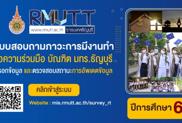 มหาวิทยาลัยเทคโนโลยีราชมงคลธัญบุรี แจ้งประชาสัมพันธ์ ขอความร่วมมือบัณฑิต มทร.ธัญบุรี รุ่นปีการศึกษา 2564 เข้ากรอกข้อมูลภาวะการมีทำ โดยสามารถกรอกข้อมูลในแบบสอบถามได้ทาง http://mis.rmutt.ac.th/survey_rt ค้นหารายชื่อบัณฑิตโดยไม่ต้องใส่คำนำหน้าชื่อ เมื่อพบรายชื่อ ให้คลิกที่ชื่อของตนเองเพื่อ Login จากนั้น ใส่รหัสนักศึกษา กรอกแบบสอบถาม 5 ขั้นตอน เมื่อเรียบร้อยแล้ว คลิก Submit เพื่อบันทึกข้อมูล จากนั้น ให้ตรวจสอบ “สถานะการอัพเดทข้อมูล” ด้วยว่าข้อมูลได้ถูกบันทึกลงฐานข้อมูลเรียบร้อยแล้วหรือไม่ โดยแบ่งเป็น ผู้ที่มีงานทำ เมื่อกรอกข้อมูลเรียบร้อยแล้ว ขอให้ Download แบบประเมินความพึงพอใจของผู้ใช้บัณฑิต เพื่อให้นายจ้างประเมินและส่งกลับยังมหาวิทยาลัยต่อไป ส่วนผู้ที่ยังไม่ทำงานหรือศึกษาต่อ ขอให้กรอกข้อมูลตามความเป็นจริง เมื่อบัณฑิตมีงานทำ ขอให้เข้ากลับมาแก้ไขข้อมูลต่อไป เข้าดูรายละเอียดได้ที่ www.rmutt.ac.th สอบถามเพิ่มเติมได้ที่ ...