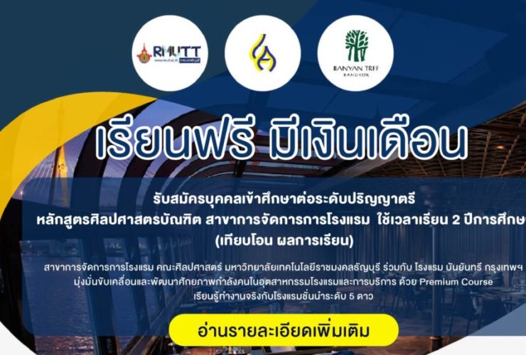 สาขาการจัดการการโรงแรม คณะศิลปศาสตร์ มหาวิทยาลัยเทคโนโลยีราชมงคลธัญบุรี ร่วมกับ โรงแรม บันยันทรี กรุงเทพฯ มุ่งมั่นขับเคลื่อนและพัฒนาศักยภาพกําลังคนในอุตสาหกรรมโรงแรมและการบริการ ด้วย Premium Course เรียนรู้ทํางานจริงกับโรงแรมชั้นนําระดับ 5 ดาว รับสมัครบุคคลเข้าศึกษาต่อระดับปริญญาตรี หลักสูตรศิลปศาสตรบัณฑิต สาขาการจัดการการโรงแรม ปีการศึกษา 2566 ใช้เวลาเรียน 2 ปีการศึกษา (เทียบโอนหน่วยกิตและประสบการณ์การทำงาน) . คุณสมบัติผู้สมัคร ไม่จํากัดเพศและอายุ สำเร็จการศึกษาระดับ ปวส. หรือผู้ที่กำลังศึกษาในภาคเรียนสุดท้าย สาขาวิชาการโรงแรม ทุกสาขางาน การจัดการงานคหกรรมเพื่อการโรงแรม การจัดการประชุมและนิทรรศการและสาขาที่เกี่ยวข้อง มีบุคลิกภาพและทัศนคติอันดีในการเรียนรู้ด้านอุตสาหกรรมบริการและการโรงแรม มีเกรดเฉลี่ยสะสมไม่น้อยกว่า 3,00 และไม่มีภาระผูกพันเรื่องทหาร สอบถามข้อมูลเพิ่มเติมได้ที่ ดร. จีณัสมา ...