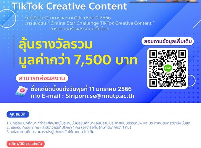สาขาวิชาการตลาด คณะบริหารธุรกิจ มหาวิทยาลัยเทคโนโลยีราชมงคลพระนคร ร่วมกับ บริษัท ไทยเบฟเวอเรจ จำกัด (มหาชน) ขอเชิญร่วมการแข่งขันประกวดคลิปวีดีโอ “Online Star Challenge TikTok Creative Content (การตลาดสร้างสรรค์บนติ๊กต๊อก) ลุ้นรางวัลรวมมูลค่ากว่า 7,500 บาท ในงานสัปดาห์วิชาการและงานวิจัย คณะบริหารธุรกิจ ประจำปี 2566 . สำหรับผู้สนใจส่งผลงานเข้าร่วมประกวดจะต้องเป็นนักเรียน นักศึกษา ที่กำลังศึกษาอยู่ในระดับชั้นมัธยมศึกษาตอนปลาย ปวช. และ ปวส. แข่งขันเป็นทีม ทีมละ 3 คน และมีอาจารย์ที่ปรึกษา 1 คน โดยผู้เข้าแข่งขันต้องส่งคลิปวีดีโอความยาวไม่เกิน 1 นาที ...