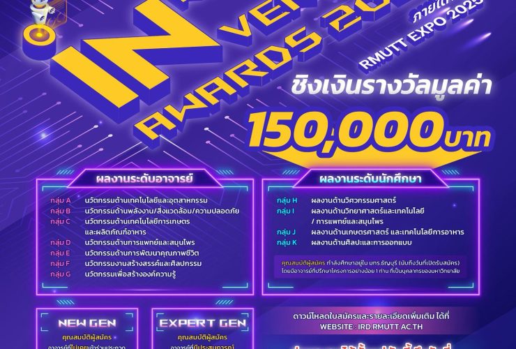 มหาวิทยาลัยเทคโนโลยีราชมงคลธัญบุรี (มทร.ธัญบุรี) โดยสถาบันวิจัยและพัฒนา ชวนผู้ที่สนใจ ผู้ประกอบการที่ต้องการพัฒนาผลิตภัณฑ์ ผู้ที่ชื่นชอบงานวิจัย สิ่งประดิษฐ์และนวัตกรรม เข้าร่วมงานมหกรรมวิจัยและนวัตกรรมครั้งใหญ่แห่งปี “RMUTT EXPO 2025” ภายใต้แนวคิด “RMUTT NEXT” พลิกโฉมงานวิจัย สร้างสรรค์นวัตกรรม เพื่ออนาคตที่ยั่งยืน ระหว่างวันที่ 29-30 สิงหาคม 2568 ณ หอประชุมใหญ่ มทร.ธัญบุรี คลอง 6 จ.ปทุมธานี ภายในงานมีกิจกรรมที่น่าสนใจ อาทิ . การประกวดผลงานวิจัยนวัตกรรม และการประกวดผลงานสิ่งประดิษฐ์ระดับอุดมศึกษาของ มทร.ธัญบุรี การประกวดผลงานวิจัย Fundamental Fund Research Awards 2025 นิทรรศการแสดงผลงานวิจัยโครงการ ...