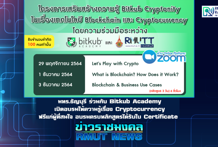 มทร.ธัญบุรี ร่วมกับ Bitkub Academy ขอเชิญนักศึกษา บุคลากรและผู้ที่สนใจ สมัครเข้าร่วมอบรมโครงการเสริมสร้างความรู้ Bitkub Cryptonity ในเรื่องเทคโนโลยี Blockchain และ Cryptocurrency ผ่านระบบ Zoom กับผู้เชี่ยวชาญด้าน Bitkub ในวันที่ 29 พ.ย. และวันที่ 1 ธ.ค. และ 3 ธ.ค. โดยแบ่งหัวข้อการอบรม Bitkub Cryptonity Courses คือ . 1.Let’s Play with Crypto: เรียนรู้เรื่องราวประวัติศาสตร์โลกการเงินตั้งแต่อดีตถึง Cryptocurrency และเรียนรู้เรื่องราวโลก Cryptocurrency ...
