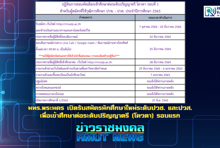 มหาวิทยาลัยเทคโนโลยีราชมงคลพระนคร เปิดรับสมัครผู้ที่สำเร็จการศึกษาระดับประกาศนียบัตรวิชาชีพ (ปวช.) และประกาศนียบัตรวิชาชีพชั้นสูง (ปวส.) เพื่อเข้าศึกษาต่อระดับปริญญาตรี ประเภทโควตา รอบที่ 1 ประจำปีการศึกษา 2565 โดยมีรายละเอียดดังนี้ ระดับ ปวช. ใน 10 คณะ ได้แก่ คณะครุศาสตร์อุตสาหกรรม คณะเทคโนโลยีคหกรรมศาสตร์ คณะเทคโนโลยีสื่อสารมวลชน คณะบริหารธุรกิจ คณะวิทยาศาสตร์และเทคโนโลยี คณะวิศวกรรมศาสตร์ คณะศิลปะศาสตร์ คณะอุตสาหกรรมสิ่งทอและออกแบบแฟชั่น คณะสถาปัตยกรรมศาสตร์และการออกแบบ และสถาบันอัญมณี ระดับ ปวส. ใน 6 คณะ ได้แก่ คณะครุศาสตร์อุตสาหกรรม คณะเทคโนโลยีคหกรรมศาสตร์ คณะบริหารธุรกิจ คณะวิศวกรรมศาสตร์ คณะศิลปศาสตร์ และคณะอุตสาหกรรมสิ่งทอและออกแบบแฟชั่น ...