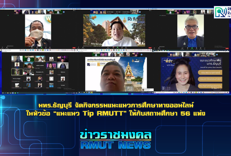 เมื่อวันที่ 23 ตุลาคม 2564 รศ.ดร.สมหมาย ผิวสะอาด อธิการบดีมหาวิทยาลัยเทคโนโลยีราชมงคลธัญบุรี พร้อมรองอธิการบดีและผู้บริหาร คณาจารย์ เจ้าหน้าที่ฝ่ายแนะแนว กองพัฒนานักศึกษา กลุ่มนักศึกษาจากหลายคณะ เข้าร่วมกิจกรรมแนะแนวการศึกษาทางออนไลน์ Zoom Meeting ในหัวข้อ “แนะแนว Tip RMUTT” โดยในช่วงเช้า มีตัวแทนนักศึกษาจากคณะเทคโนโลยีสื่อสารมวลชน คณะศิลปกรรมศาสตร์และคณะวิศวกรรมศาสตร์ เข้าร่วมแนะแนว ส่วนในช่วงบ่าย มีตัวแทนนักศึกษาจากคณะพยาบาลศาสตร์ คณะวิทยาศาสตร์และเทคโนโลยีและคณะบริหารธุรกิจ เข้าร่วมแนะแนว ซึ่งมีสถานศึกษาเข้าร่วมรับฟังการแนะแนวข้อมูลการศึกษาทั้งหมด 56 แห่ง แบ่งเป็นระดับอาชีวศึกษา เทคนิค พาณิชยการและวิทยาลัยการอาชีพ จำนวน 17 แห่งและระดับมัธยมศึกษาปีที่ 6 จำนวน 39 แห่ง ...