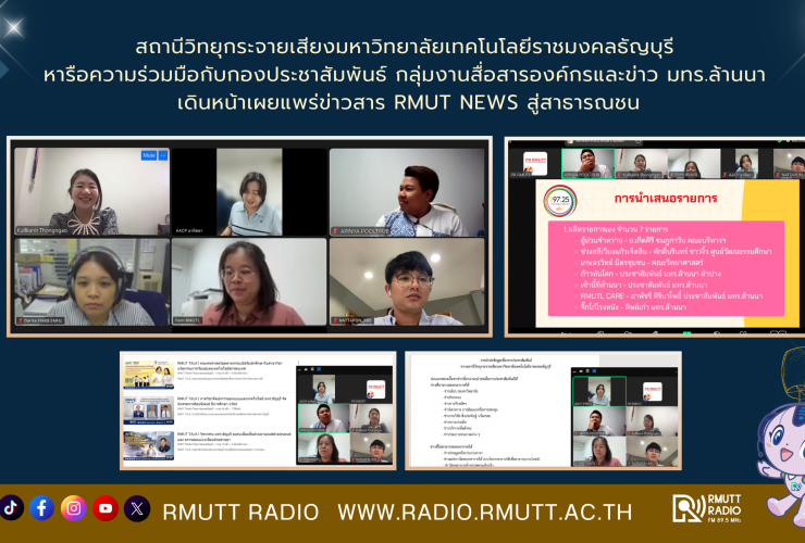 วันที่ 15 สิงหาคม 2568 สถานีวิทยุกระจายเสียง มหาวิทยาลัยเทคโนโลยีราชมงคลธัญบุรี (มทร.ธัญบุรี) FM 89.5 MHz โดยรองศาสตราจารย์ ดร.กุลกนิษฐ์ ทองเงา ผู้อำนวยการสถานีวิทยุฯ พร้อมทีมผลิตรายการและข่าว ได้เข้าร่วมการประชุมผ่านทางระบบออนไลน์ Zoom meeting กับกองประชาสัมพันธ์ กลุ่มงานสื่อสารองค์กรและข่าว มหาวิทยาลัยเทคโนโลยีราชมงคลล้านนา (มทร.ล้านนา) โดย คุณอภิญญา พูลทรัพย์ นักประชาสัมพันธ์ ชำนาญการ หัวหน้างานสื่อสารองค์กรและข่าว และคุณธริษตรี ธนรัตนพิมลกุล นักประชาสัมพันธ์ ปฏิบัติการ สถานีวิทยุ มทร.ล้านนา TECHNO RADIO 97.25 MHz. เพื่อการหารือถึงแนวทางการประชาสัมพันธ์ข้อมูลข่าวสารของ มทร.ล้านนา ...