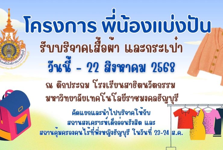 โรงเรียนสาธิตนวัตกรรม มหาวิทยาลัยเทคโนโลยีราชมงคลธัญบุรี (มทร.ธัญบุรี) ขอเชิญชวนทุกท่านร่วมเป็นส่วนหนึ่งของการให้ ใน “โครงการพี่น้องแบ่งปัน” ร่วมแบ่งปัน สานใจ ส่งต่อความสุขให้กันและกัน ช่วยส่งต่อความอบอุ่นและโอกาสให้กับผู้ด้อยโอกาสในสังคม ด้วยการบริจาคเสื้อผ้าและกระเป๋า โดยสิ่งของที่ท่านบริจาคจะถูกคัดแยกและนำไปบริจาคให้สถานสงเคราะห์เด็กอ่อนรังสิต และสถานคุ้มครองคนไร้ที่พึ่งหญิงธัญบุรี ส่งมอบให้กับผู้ที่ต้องการ ทั้งผู้ยากไร้ หรือผู้ที่ขาดแคลน เพื่อให้พวกเขาเหล่านี้ได้มีเครื่องนุ่งห่มที่เพียงพอและได้ใช้ประโยชน์ เพื่อการดำรงชีวิต โดยเปิดรับสิ่งของตั้งแต่บัดนี้ – 22 สิงหาคม 2568 ณ หน้าห้องสำนักงาน อาคารเฉลิมพระเกียรติฯ โรงเรียนสาธิตนวัตกรรม มทร.ธัญบุรี จ.ปทุมธานี . การบริจาคของท่านไม่เพียงแต่เป็นการแบ่งปันสิ่งของ แต่ยังเป็นการมอบความหวัง กำลังใจ และสร้างรอยยิ้มให้กับผู้ที่กำลังเผชิญความยากลำบาก จึงขอเชิญชวนมาร่วมเป็นส่วนหนึ่งของการสร้างสังคมแห่งการแบ่งปันที่เข้มแข็งไปด้วยกัน สอบถามรายละเอียดได้ที่ Facebook: RMUTT Innovation Demonstration ...