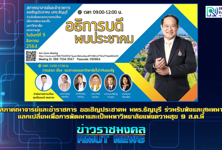 สภาคณาจารย์และข้าราชการมหาวิทยาลัยเทคโนโลยีราชมงคลธัญบุรี ขอเชิญประชาคม มทร.ธัญบุรี ร่วมรับฟังและสนทนาแลกเปลี่ยนเพื่อการพัฒนาและเป็นมหาวิทยาลัยแห่งความสุข วันจันทร์ที่ 9 สิงหาคม 2564 ทางระบบ Zoom Meeting เพื่อเปิดโอกาสให้บุคลากรได้ได้รับฟังผลการบริหารงาน สอบถาม และติดตามผลงานของท่านอธิการบดีที่นำเสนอนโยบายต่อประชาคม และเพื่อสร้างความรู้และความเข้าใจในบริบทของการปรับเปลี่ยนเป็นมหาวิทยาลัยในกำกับของรัฐ และเตรียมความพร้อมรับมือต่อการเปลี่ยนแปลง เพื่อก่อให้เกิดประสิทธิภาพสูงสุดต่อให้การพัฒนามหาวิทยาลัยเทคโนโลยีราชมงคลธัญบุรีอย่างยั่งยืน โดยในช่วงเช้า เวลา 09:00- 12:00 น. อธิการบดี พบประชาคม และช่วงบ่าย เวลา 13:00 – 17:00 น. พบกับการเสวนา เรื่อง แนวทางของมหาวิทยาลัยในกำกับของรัฐ สอบถามข้อมูลเพิ่มเติมได้ที่ แฟนเพจเฟซบุ๊ก มหาวิทยาลัยเทคโนโลยีราชมงคลธัญบุรี . ณัฐพล ดีอุต วิทยุราชมงคลธัญบุรี ...