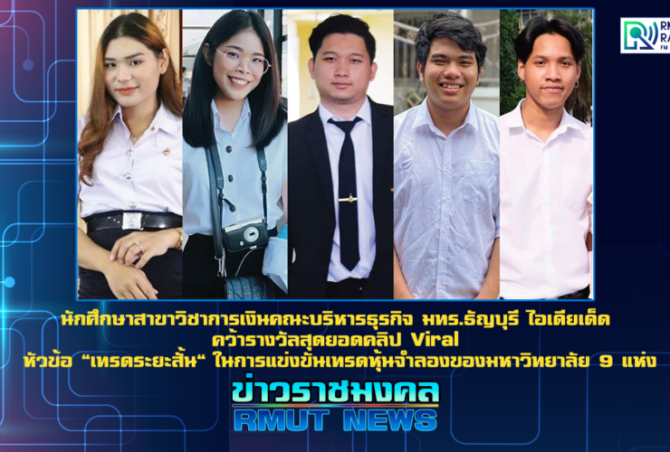 นักศึกษาชั้นปีที่ 3 สาขาวิชาการเงินคณะบริหารธุรกิจ มหาวิทยาลัยเทคโนโลยีราชมงคลธัญบุรี (มทร.ธัญบุรี) นายสุรเมศวร์ อ้นฉ่ำ น.ส.นภัสสร วรโพธิ์ นายธาดา ทองบุญ นายนันทพงศ์ สังข์นัครา และ นายสุทัศน์ อินทริง คว้ารางวัลสุดยอดคลิป Viral หัวข้อ “เทรดระยะสั้น” และรางวัลสุดยอดคลิป Viral Popular Vote Insunis “HERO Stock U-Challenge” ในการแข่งขัน เทรดหุ้นจำลองของมหาวิทยาลัย 9 แห่ง ได้แก่ มหาวิทยาลัยเทคโนโลยีราชมงคลธัญบุรี มหาวิทยาลัยธุรกิจบัณฑิตย์ มหาวิทยาลัยกรุงเทพ มหาวิทยาลัยรังสิต มหาวิทยาลัยหอการค้าไทย มหาวิทยาลัยศรีนครินทรวิโรฒ มหาวิทยาลัยสยาม ...