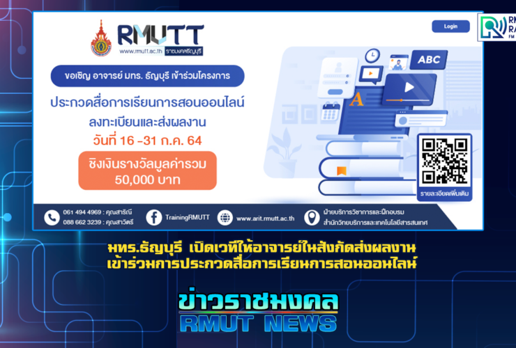 มหาวิทยาลัยเทคโนโลยีราชมงคลธัญบุรี จัดโครงการประกวดสื่อการเรียนการสอนออนไลน์ เพื่อตอบสนองประเด็นยุทธศาสตร์ที่ 1 การเรียนรู้สู่การเป็นนวัตกร ที่มุ่งเน้นการพัฒนาคุณภาพและมาตรฐานการศึกษาโดยการใช้เทคโนโลยีเป็นเครื่องมือในการจัดการเรียนรู้ จึงขอเชิญชวนอาจารย์ในสังกัดมหาวิทยาลัยเทคโนโลยีราชมงคลธัญบุรี ร่วมส่งผลงานเข้าร่วมการประกวดสื่อการเรียนการสอนออนไลน์ รับจำนวนจำกัด 50 ผลงาน ชิงเงินรางวัลรวม 50,000 บาท ได้แก่ รางวัลที่ 1 เงินรางวัล 10,000 บาท พร้อมโล่รางวัล รางวัลที่ 2 เงินรางวัล 8,000 บาท พร้อมโล่รางวัล รางวัลที่ 3 เงินรางวัล 5,000 บาท พร้อมโล่รางวัล รางวัลชมเชย 9 รางวัล เงินรางวัล 3,000 บาท พร้อมเกียรติบัตร ...