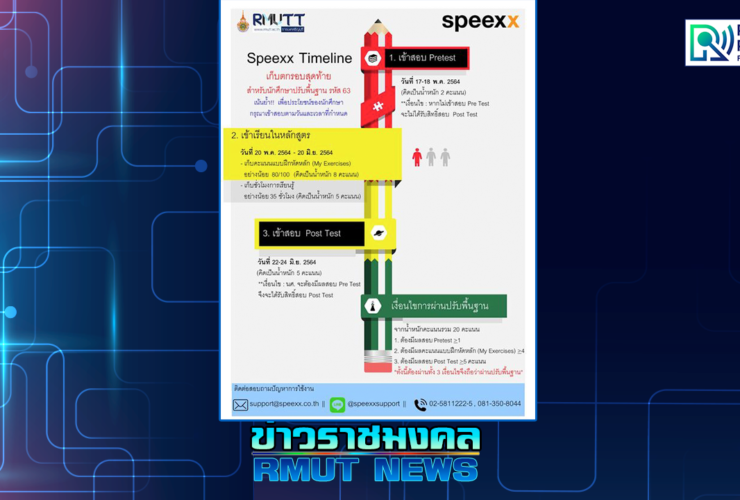 ฝ่ายกิจกรรมพัฒนานักศึกษา กองพัฒนานักศึกษา มหาวิทยาลัยเทคโนโลยีราชมงคลธัญบุรี หรือ มทร. ธัญบุรี ได้แจ้งนักศึกษาปีการศึกษา 2563 ที่ยังไม่ผ่านการสอบปรับพื้นฐาน ในรายวิชา GE0002 หรือ Speexx Timeline เข้าสอบในรอบเก็บตกสุดท้าย โดยมีรายละเอียดดังนี้ 1. เข้าสอบ Pretest วันที่ 17-18 พฤษภาคม 2564 และมีเงื่อนไข : หากไม่เข้าสอบ Pre Test จะไม่ได้รับสิทธิ์สอบ Post Test 2. เข้าเรียนในหลักสูตร ในวันที่ 20 พฤษภาคม 2564 – 20 มิถุนายน ...