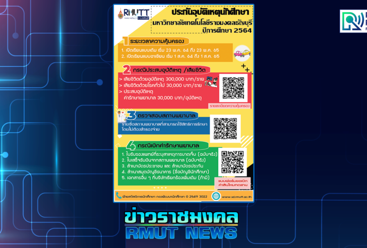 ฝ่ายสวัสดิการนักศึกษา มหาวิทยาลัยเทคโนโลยีราชมงคลธัญบุรี หรือ มทร.ธัญบุรี ได้แจ้งการทำประกันอุบัติเหตุแก่นักศึกษา ปีการศึกษา 2564 โดยมีรายละเอียด ดังนี้ 1. ระยะเวลาความคุ้มครอง – เปิดเรียนแบบเดิม เริ่ม 23 พฤษภาคม 2564 – 23 พฤษภาคม 2565 และเปิดเรียนแบบอาเซียน เริ่ม 1 สิงหาคม 2564 – 1 สิงหาคม 2565 โดยมาระยะเวลาคุ้มครองเป็นเวลา 1 ปี 2.กรณีประสบอุบัติเหตุ/เสียชีวิต – เสียชีวิตด้วยอุบัติเหตุจะได้รับไม่เกิน 300,000 บาท/ราย -เสียชีวิตด้วยโรคทั่วไป จะได้รับไม่เกิน ...