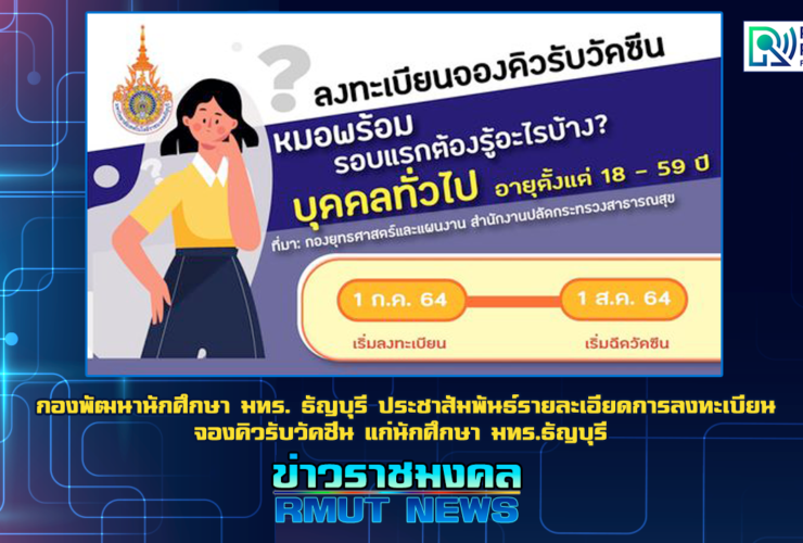 จากสถานการณ์การแพร่ระบาดของไวรัสโควิด 19 ทำให้ มทร.ธัญบุรี มีความความห่วงใยนักศึกษาเป็นอย่างมาก จึงมอบหมายให้ฝ่ายกิจกรรมพัฒนานักศึกษา กองพัฒนานักศึกษา มหาวิทยาลัยเทคโนโลยีราชมงคลธัญบุรี หรือ มทร.ธัญบุรี ประชาสัมพันธ์รายละเอียดการลงทะเบียนจองคิวรับวัคซีน เพื่อให้นักศึกษา มทร.ธัญบุรี ที่ต้องการจะรับวัคซีน ได้เตรียมความพร้อมในการลงทะเบียนได้อย่างถูกต้อง โดยรายละเอียดในประชาสัมพันธ์มีดังนี้ . 1. เริ่มลงทะเบียนตั้งแต่วันที่ 1 กรกฎาคม 2564 และเริ่มฉีดวัคซีนในวันที่ 1 สิงหาคม 2564 2. ผู้ที่รับวัคซีนได้ต้องมีอายุ 18 -59 ปี 3. รายชื่อผู้ได้รับสิทธิ์จะถูกส่งไปยังโรงพยาบาลทั่วประเทศโดยคัดกรองจากประวัติการรักษา 4. หากมีรายชื่อตกหล่น ให้แจ้งโรงพยาบาลที่มีประวัติการรักษาเพื่อนำรายชื่อเข้าระบบ 5.เมื่อได้รับวัคซีนแล้ว ร่างกายจะเกิดการกระตุ้นให้สร้างภูมิคุ้มกันขึ้น 6. หลังจากรับวัคซีนครบทั้ง ...