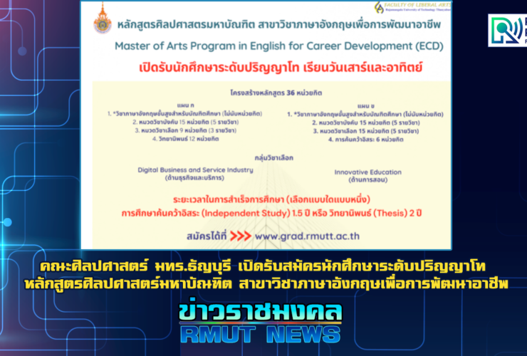 คณะศิลปศาสตร์ มหาวิทยาลัยเทคโนโลยีราชมงคลธัญบุรี ได้เปิดรับสมัครนักศึกษาระดับปริญญาโท หลักสูตรศิลปศาสตร์มหาบัณฑิต สาขาวิชาภาษาอังกฤษเพื่อการพัฒนาอาชีพ เรียนวันเสาร์และวันอาทิตย์เท่านั้น โดยมี 36 หน่วยกิต และมีสองหลักสูตร ซึ่งหลักสูตรที่ 1 จะเป็นวิชาภาษาอังกฤษขั้นสูงสำหรับบัณฑิตศึกษา และ 2 จะเป็นวิชาภาษาอังกฤษขั้นสูงสำหรับบัณฑิตศึกษา โดยระยะเวลาในการสำเร็จการศึกษา (เลือกแบบใดแบบหนึ่ง) การศึกษาค้นคว้าอิสระ 1.5 ปี หรือ วิทยานิพนธ์ 2 ปี เกณฑ์คะแนนสอบวัดระดับภาษาอังกฤษในการรับสมัคร TOEIC 500 คะแนน,TOEFL (แบบPBT) 450 คะแนน , TOEFL(แบบCBT) 100คะแนน, TOEFL (แบบIBT) 45 คะแนน โดยเลือกอย่างใดอย่างหนึ่ง ...