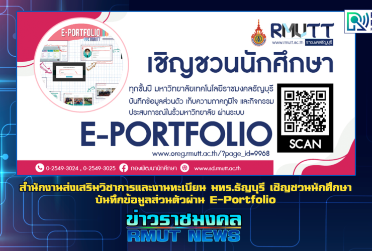 สำนักงานส่งเสริมวิชาการและงานทะเบียน มหาวิทยาลัยเทคโนโลยีราชมงคลธัญบุรี ได้สร้างระบบในการบันทึกข้อมูลนักศึกษาในชื่อว่า E-Portfolio โดยภายในระบบ นักศึกษาสามารถบันทึกรายละเอียดต่าง ๆของตนเอง ได้ดังนี้ ข้อมูลส่วนตัว , การฝึกประสบการณ์ , รางวัล/ความภาคภูมิใจ , กิจกรรมระหว่างเรียน , ทักษะวิชาการ , ทักษะภาษา , สมรรถนะ ซึ่งระบบ E-Portfolio คือการทำ Portfolio ทางออนไลน์โดยที่นักศึกษาไม่ต้องทำใหม่เมื่อจบการศึกษา นักศึกษาสามารถกดอนุญาตให้ทุกคนที่มี QR-Code เข้าดูข้อมูลของท่านได้ผ่านทาง QR-Code และกดอนุญาตให้มหาวิทยาลัยสามารถประชาสัมพันธ์ข้อมูลของท่านแก่บุคคลที่เกี่ยวข้องกับการจัดหางาน หรือโอกาสในการสัมภาษณ์งานผ่านทางมหาวิทยาลัย ทั้งนี้การเข้าระบบบันทึก E-Portfolio เพื่อประโยชน์แก่ตัวนักศึกษาในการยื่นประกอบกิจกรรมต่าง ๆ ทั้งการประกวดแข่งขัน การขอทุน และการสมัครงานเมื่อจบการศึกษา โดยบันทึกสะสมไปเรื่อย ...