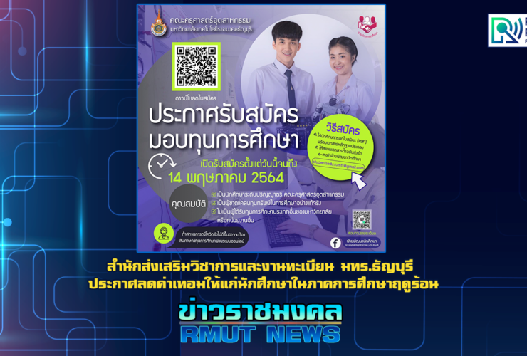คณะครุศาสตร์อุตสาหกรรม มหาวิทยาลัยเทคโนโลยีราชมงคลธัญบุรี หรือ มทร.ธัญบุรี ได้เปิดโอกาสให้แก่นักศึกษาคณะครุศาสตร์อุตสาหกรรมที่ขาดแคลนทุนทรัพย์ สมัครรับทุนการศึกษาหรือทุนให้เปล่า ซึ่งนักศึกษาที่สนใจจะสมัครรับทุนต้องมีคุณสมบัติ ได้แก่ . 1.เป็นนักศึกษาระดับปริญญาตรี คณะครุศาสตร์อุตสาหกรรม 2. เป็นผู้ขาดแคลนทุนทรัพย์ในการศึกษาอย่างแท้จริง 3.ไม่เป็นผู้ได้รับทุนการศึกษาประเภทอื่นของมหาวิทยาลัย และหน่วยงานอื่น . นักศึกษาสามารถดาวน์โหลดเอกสารใบสมัครขอทุนการศึกษาได้ที่ FACEBOOK: ฝ่ายพัฒนานักศึกษา คณะครุศาสตร์อุตสาหกรรม โดยการสัมภาษณ์ หากสถานการณ์การแพร่ระบาดของไวรัสโควิด-19 ยังไม่ดีขึ้น ทางคณะอาจมีการสัมภาษณ์ทุนการศึกษาผ่านระบบทางออนไลน์ ซึ่งหากมีการเปลี่ยนแปลงจะแจ้งให้ทราบผ่านทาง FACEBOOK: ฝ่ายพัฒนานักศึกษา คณะครุศาสตร์อุตสาหกรรม . น.ส.รุ่งฤทัย แขกพงษ์ วิทยุราชมงคลธัญบุรี รายงาน ...