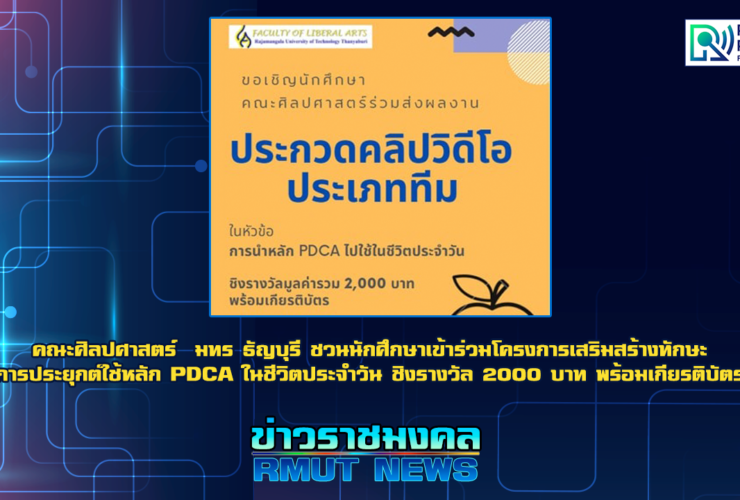 คณะศิลปศาสตร์ มหาวิทยาลัยเทคโนโลยีราชมงคลธัญบุรี หรือ มทร.ธัญบุรี ได้จัดโครงการเสริมสร้างทักษะการประยุกต์ใช้หลัก PDCA ภายใต้หัวข้อ PDCA ไปใช้ในชีวิตประจำวันนักศึกษาที่สนใจสามารถเข้าร่วมได้ทุกชั้นปี ทุกสาขา โดยมีกติกาการประกวดคลิปวิดิโอ คือ 1.ทีมที่เข้าประกวดจะต้องเป็นนักศึกษาคณะศิลปศาสตร์ที่กำลังศึกษาอยู่เท่านั้น 2.ส่งผลงานเข้าประกวดแบบทีม ทีมละ 3-5 คน 3.ผลงานวิดีโอต้องมีเนื้อหาที่สอดคล้องกับ การนำหลัก PDCA ไปใช้ในชีวิตประจำวัน ความยาวไม่เกิน 3 นาที เนื่องจากสถานการณ์การแพร่ระบาดของโควิด-19 จึงกำหนดให้สมาชิกในทีมทำการถ่ายวิดีโอในสถานที่ของตนเอง ห้ามรวมกลุ่มเพื่อถ่ายวิดีโอ สามารถส่งผลงานคลิปวิดีโอได้ที่อีเมล์ sdlartsrmutt@gmail.com ภายในวันศุกร์ที่ 14 พฤษภาคม 2564 เวลา 18.00 น. นักศึกษาที่สนใจสามารถติดต่อสอบถามรายละเอียดเพิ่มเติมได้ทาง facebook : สโมสรนักศึกษาคณะศิลปะศาสตร์ ...