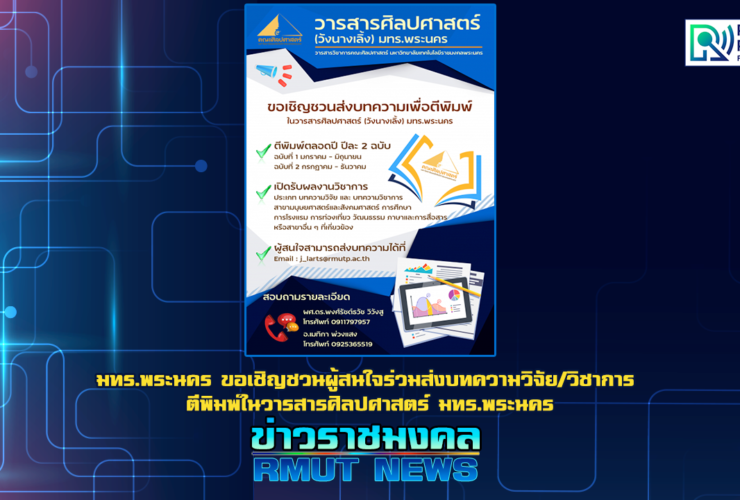 คณะศิลปศาสตร์ มหาวิทยาลัยเทคโนโลยีราชมงคลพระนคร ขอเชิญชวนนักศึกษา นักวิจัย นักวิชาการ และบุคคลทั่วไป ร่วมส่งบทความผลงานวิชาการประเภท บทความวิจัย และบทความวิชาการในสาขามนุษยศาสตร์และสังคมศาสตร์ การโรงแรม การท่องเที่ยว วัฒนธรรม ภาษาและการสื่อสาร การศึกษา หรือสาขาอื่นที่เกี่ยวข้อง เพื่อตีพิมพ์ในวารสารศิลปศาสตร์ มหาวิทยาลัยเทคโนโลยีราชมงคลพระนคร เพื่อเป็นสื่อและช่องทางในการเผยแพร่ความรู้ผลงานวิจัย โดยวารสารจะตีพิมพ์ปีละ 2 ฉบับ ฉบับที่ 1 มกราคม -มิถุนายน และฉบับที่ 2 กรกฎาคม – ธันวาคมผู้สนใจสามารถส่งบทความแบบเต็มรูปแบบ รวมถึงบทความวิชาการ ซึ่งสามารถเสนอได้ทั้งภาษาไทยและภาษาอังกฤษ โดยบทความดังกล่าวจะต้องไม่เคยเผยแพร่ในวารสารการประชุมวิชาการหรือสิ่งพิมพ์อื่นใดมาก่อน และเป็นข้อคิดเห็นของผู้ส่งบทความเท่านั้น ส่งบทความได้ ตั้งแต่บัดนี้เป็นต้นไปที่ Email : j_larts@rmutp.ac.th ผู้สนใจดูรายละเอียดเพิ่มเติมที่ ...