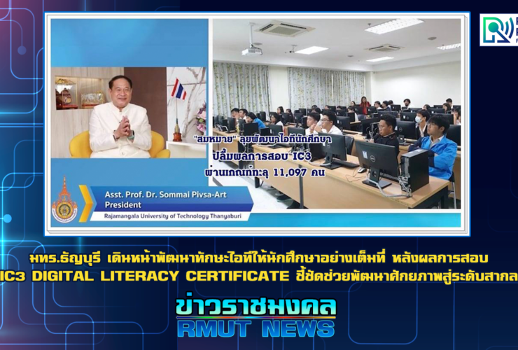 ผู้ช่วยศาสตราจารย์ ดร. สมหมาย ผิวสอาด อธิการบดีมหาวิทยาลัยเทคโนโลยีราชมงคลธัญบุรี หรือ มทร.ธัญบุรี ได้ให้สัมภาษณ์เป็นภาษาอังกฤษเกี่ยวกับ RMUTT IC3 Success Story in Thailand ซึ่งทาง Certiport ประเทศสหรัฐอเมริกาได้นำไปเผยแพร่ในการประชุมออนไลน์ ผ่านทาง Website ให้กับทุกๆประเทศได้ทราบ ถึงความสำเร็จในการพัฒนาทักษะดิจิทัล ให้กับนักศึกษาของ มทร.ธัญบุรี โดยอธิการบดี มทร.ธัญบุรี กล่าวว่า ในปีการศึกษา 2563 นี้มีนักศีกษาที่ มทร.ธัญบุรีเข้าสอบทั้งหมด 2,665 คน และสอบผ่านมาตรฐาน IC3 จำนวน 2,332 คน คิดเป็น 87.50% เมื่อรวมการสอบที่ผ่านมา ...
