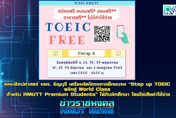 คณะศิลปศาสตร์ มหาวิทยาลัยเทคโนโลยีราชมงคลธัญบุรี หรือ มทร.ธัญบุรี ได้จัดโครงการฝึกอบรม “Step up TOEIC พลิกสู่ World Class สำหรับ RMUTT Premium Students” ให้แก่นักศึกษา มทร.ธัญบุรี ที่มีความสนใจเข้าร่วมฝึกอบรม เพื่อเตรียมความพร้อมในการสอบ TOEIC หรือเพิ่มประสิทธิภาพการเรียนในห้องเรียน โดยมีเงื่อนไข 3 ข้อคือ นักศึกษาต้องเรียนครบ 100% 8 ครั้งหรือ 48 ชั่วโมง ต้องสอบ Post test ได้คะแนน 550 คะแนนขึ้นไป การฝึกอบรมในครั้งนี้ไม่มีค่าใช้จ่าย แต่จะมีค่าประกันสอบ ได้คืน ณ ...