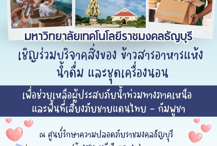 มหาวิทยาลัยเทคโนโลยีราชมงคลธัญบุรี (มทร.ธัญบุรี) เชิญชวนผู้ที่สนใจร่วมบริจาคสิ่งของ ข้าวสารอาหารแห้ง น้ำดื่ม และชุดเครื่องนอน เพื่อช่วยเหลือผู้ประสบภัยน้ำท่วมทางภาคเหนือ และพื้นที่เสี่ยงภัยชายแดนไทย – กัมพูชา ณ ศูนย์รักษาความปลอดภัยราชมงคลธัญบุรี (ข้างสนามกีฬากลางฯ) มหาวิทยาลัยเทคโนโลยีราชมงคลธัญบุรี จ.ปทุมธานี โทรศัพท์ 0 2549 3195 สอบถามเพิ่มเติมได้ที่ Facebook มหาวิทยาลัยเทคโนโลยีราชมงคลัญบุรี . รายงานโดย อาทิตยา ปักกะทานัง ...