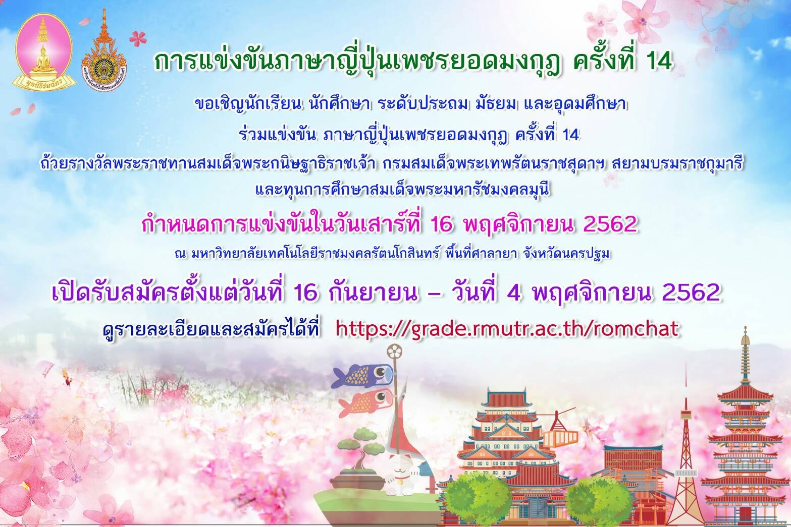 มูลนิธิร่มฉัตร ร่วมกับมหาวิทยาลัยเทคโนโลยีราชมงคลรัตนโกสินทร์ จัดการแข่งขันภาษาญี่ปุ่นเพชรยอดมงกุฎ ครั้งที่ 14 ขอเชิญนักเรียน นิสิต นักศึกษา ระดับชั้นประถมศึกษา มัธยมศึกษา และอุดมศึกษา เข้าร่วมแข่งขันถ้วยพระราชทานสมเด็จพระกนิษฐาธิราชเจ้า กรมสมเด็จพระเทพรัตนราชสุดาฯ สยามบรมราชกุมารี และทุนการศึกษาอื่นๆ โดยมีกำหนดสอบแข่งขันวันเสาร์ ที่ 16 พฤศจิกายน 2562 ณ มหาวิทยาลัยเทคโนโลยีราชมงคลรัตนโกสินทร์ พื้นที่ศาลายา จังหวัดนครปฐม เปิดรับสมัคร 16 กันยายน – 4 พฤศจิกายน 2562 ดูรายละเอียดเพิ่มเติมได้ที่ https://grade.rmutr.ac.th/romchat ...