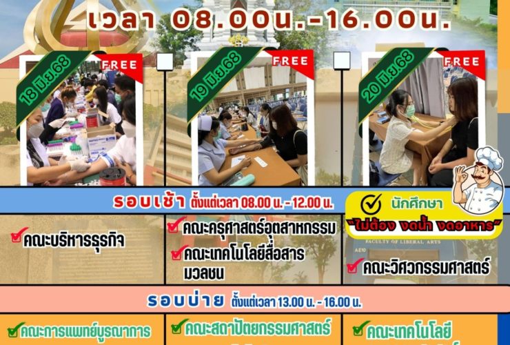 มหาวิทยาลัยเทคโนโลยีราชมงคลธัญบุรี โดย กองพัฒนานักศึกษา แจ้งกำหนดการตรวจสุขภาพนักศึกษาใหม่ ประจำปีการศึกษา 2568 ครั้งที่ 1 ระหว่างวันที่ 18 – 20 มิถุนายน 2568 ณ หอประชุม มหาวิทยาลัยเทคโนโลยีราชมงคลธัญบุรี จ.ปทุมธานี . โดยได้กำหนดให้นักศึกษาแต่ละคณะเข้ารับการตรวจสุขภาพ ดังนี้ . วันพุธที่ 18 มิถุนายน 2568 รอบเช้า เวลา 08.00 – 12.00 น. คณะบริหารธุรกิจ รอบบ่าย เวลา 13.00 – 16.00 น. คณะการแพทย์บูรณาการ ...