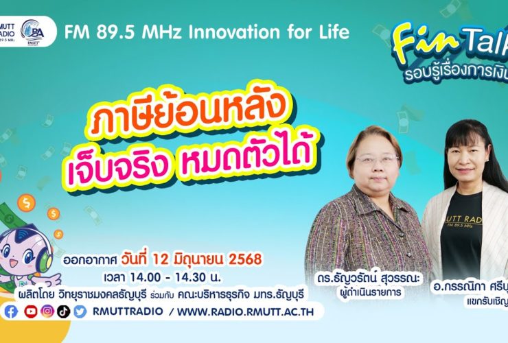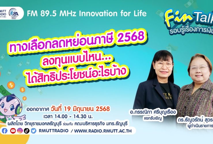 FIN TALK [EP.94] ทางเลือกลดหย่อนภาษี 2568 ลงทุนแบบไหนได้สิทธิประโยชน์อะไรบ้าง การวางแผนการออมและการลงทุนระยะยาวควบคู่กับการใช้สิทธิลดหย่อนภาษีกลายเป็นหัวข้อที่ได้รับความสนใจอย่างมาก เนื่องจากภาครัฐมีนโยบายสนับสนุนให้มีการลงทุนเพิ่มเติม ดังนั้น เพื่อเป็นข้อมูลให้ ผู้ลงทุนในการบริหารจัดการภาษีได้อย่างมีประสิทธิภาพ บทความนี้จึงขอให้ภาพรวมเกี่ยวกับทางเลือกการออมและการลงทุนที่ได้รับสิทธิลดหย่อนภาษีสำหรับปี 2568 รับฟังรายการได้ทาง FM 89.5 MHz Innovationforlife วิทยุราชมงคลธัญบุรี ออกอากาศ วันที่ 19 มิถุนายน 2568 ผู้ดำเนินรายการโดย ดร.ธัญวรัตน์ สุวรรณะ – อ.กรรณิกา ศรีบุญเรือง ...
