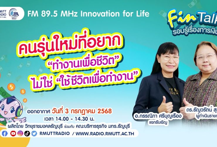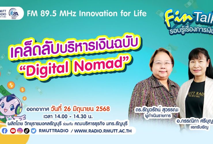 FIN TALK [EP.95] เคล็ดลับบริหารเงินฉบับ Digital Nomad Digital Nomad คือใคร? คือคนยุคใหม่ที่ไม่ต้องมี ‘ออฟฟิศ’ ก็มีรายได้ ทำงานผ่านอินเทอร์เน็ต และสามารถใช้ชีวิตอยู่ที่ไหนก็ได้ในโลก โดยไม่ต้องผูกติดกับสถานที่ทำงานประจำ เช่น ฟรีแลนซ์สายงานดิจิทัล (เช่น โปรแกรมเมอร์, กราฟิกดีไซเนอร์, คอนเทนต์ครีเอเตอร์) คนขายของออนไลน์ ผู้ประกอบการออนไลน์ หรือเจ้าของธุรกิจที่จัดการจากระยะไกลได้ รับฟังรายการได้ทาง FM 89.5 MHz Innovationforlife วิทยุราชมงคลธัญบุรี ออกอากาศ วันที่ 26 มิถุนายน 2568 ผู้ดำเนินรายการโดย ดร.ธัญวรัตน์ สุวรรณะ – อ.กรรณิกา ...