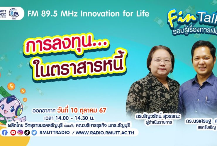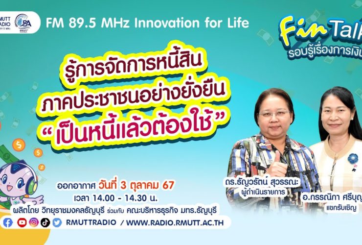 FIN TALK [EP.83] เคล็ดลับจัดการหนี้ครัวเรือน ฉบับคนไทย การกู้หนี้ยืมสินไม่ใช่เรื่องผิด หากนำมาใช้ในยามจำเป็นหรือเพื่อสร้างรายได้ เช่น จ่ายค่ารักษาพยาบาลคนในครอบครัว นำไปลงทุนธุรกิจ หรือ ซื้อที่อยู่อาศัย พูดง่าย ๆ ก็คือ การก่อหนี้เป็นกลไกในระบบเศรษฐกิจที่ช่วยดึงทรัพยากรจากคนที่มีเงินเหลือ ไปให้กับคนที่ต้องการใช้เงิน หนี้ช่วยเสริมสภาพคล่องเพื่อสร้างโอกาสหรือทำให้ฝ่าฟันความยากลำบากไปได้ รับฟังรายการได้ทาง FM 89.5 MHz Innovationforlife วิทยุราชมงคลธัญบุรี ออกอากาศ วันที่ 3 เมษายน 2568 ผู้ดำเนินรายการโดย ดร.ธัญวรัตน์ สุวรรณะ – อ.กรรณิกา ศรีบุญเรือง ...