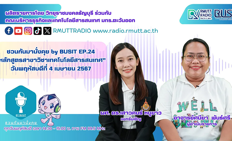 ชวนกันมานั่งคุย BY BUSIT [EP.30] หลักสูตรสาขาวิชาการตลาด คณะบริหารธุรกิจและเทคโนโลยีสารสนเทศ มทร.ตะวันออก ความเป็นมาของสาขาและการเรียนการสอนที่น่าสนใจ จุดเด่น ของสาขาและการเปิดรับสมัครนักศึกษา ในแต่ละครั้งมีหลักเกณฑ์ในการคัดเลือกนักศึกษาทุน โควตาต่างๆ ที่ทางสาขาและคณะมอบให้บอกถึงผลประกอบการในการส่งนักศึกษาไปสหกิจศึกษาและการฝึกงานผลตอบรับการรับนักศึกษาเข้าทำงานหลังจบการศึกษาที่มีเปอร์เซ็นต์ในการงานทำที่ดีบอกถึงผลสำเร็จในการประกอบวิชาชีพของนักศึกษาที่จบไปและผลงานของนักศึกษาปัจจุบันที่มีผลงานเป็นที่ประจักษ์ รับฟังรายการได้ทาง FM 89.5 MHz Innovationforlife วิทยุราชมงคลธัญบุรี ออกอากาศ วันที่ 16 พฤษภาคม 2567 เวลา 14.30 – 15.00 น. ดำเนินรายการโดย อาจารย์ศนียา พันธ์ศรี แขกรับเชิญ ผศ.ดร.ภาวิณี ทองแย้ม หัวหน้าสาขาวิชาการตลาด คณะบริหารธุรกิจและเทคโนโลยีสารสนเทศ มทร.ตะวันออก ...