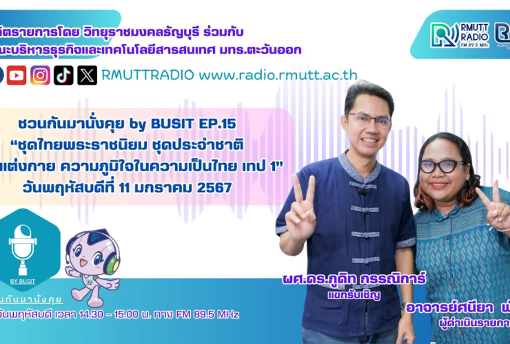 ชวนกันมานั่งคุย BY BUSIT [EP.15] ชุดไทยพระราชนิยม ชุดประจำชาติ การแต่งกาย ความภูมิใจในความเป็นไทย เทป 1 สัปดาห์นี้ มาพูดคุยถึงความงดงามของชุดไทยพระราชนิยม ชุดประจำชาติ การแต่งกาย ความภูมิใจในความเป็นไทย โดย ผศ.ดร.ภูดิท กรรณิการ์ อาจารย์ประจำสาขาวิชาเทคโนโลยีมัลติมีเดีย มทร.ตะวันออก ดำเนินรายการโดย อาจารย์ศนียา พันธ์ศรี รับฟังรายการได้ทาง FM 89.5 MHz วิทยุราชมงคลธัญบุรีออกอากาศ วันที่ 11 มกราคม 2567 เวลา 14.30 – 15.00 น. ผู้ดำเนินรายการโดย อาจารย์ศนียา พันธ์ศรี ...